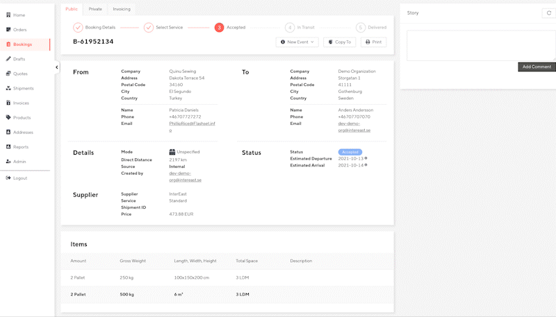 Every shipment has its own story. Via its chat, you easily reach your forwarder and all logged information concerning your booking.